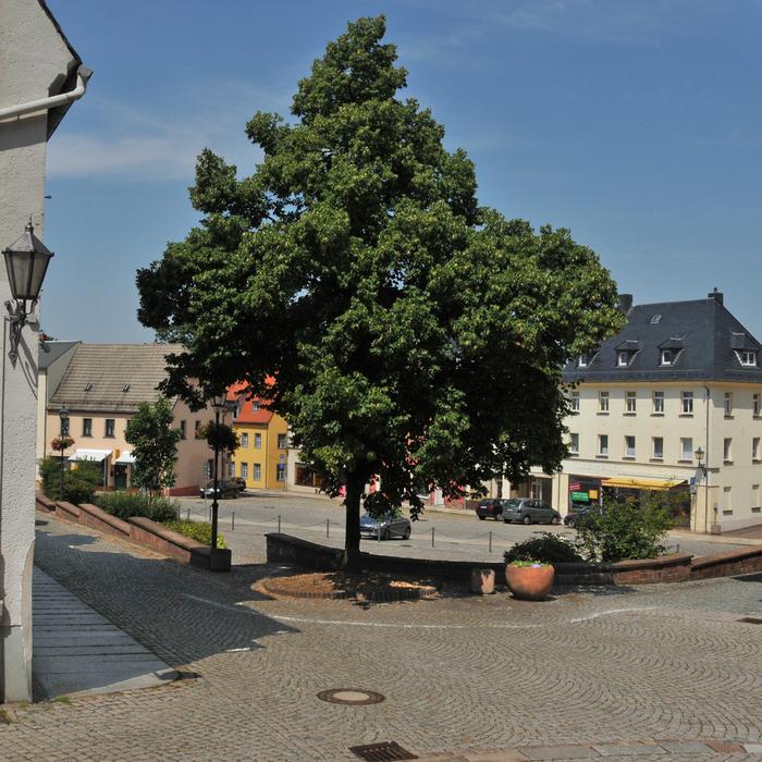 Burgstädt, am Brühl 12. Das Haus rechts (um 1800), ist eine Wohn- und Geschäftshaus, als Möbelhaus Otto Steudten, mit Laden