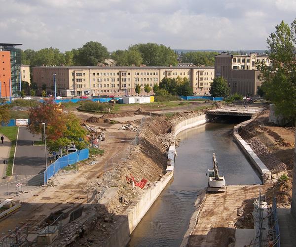 Chemnitzaue.Dieser Bogen der Chemnitz wurde 2008 wieder freigelegt und endlich ieder sichtbar. Die nahe Straße rug noch den Namen "Aue".