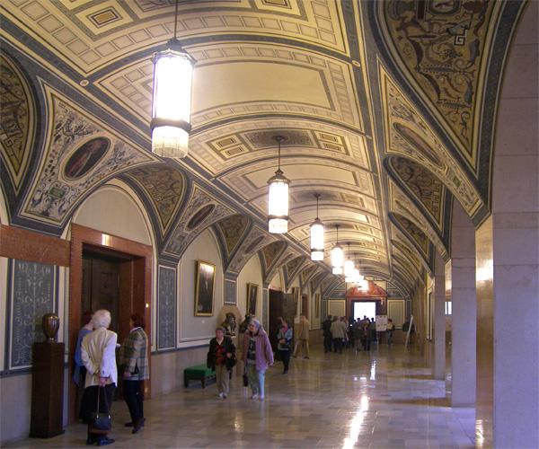 Rathausgangmit schön ausgemalden Wänden und einem Pater Noster. Geht der noch?