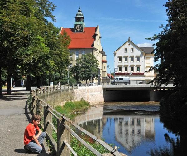 An der Chemnitz.In Bildmitte das als Reformgymnasium 1910 erbaute gebäude mit markantem Uhrenturm und schwungvollem Giebel > Schloßstraße 3