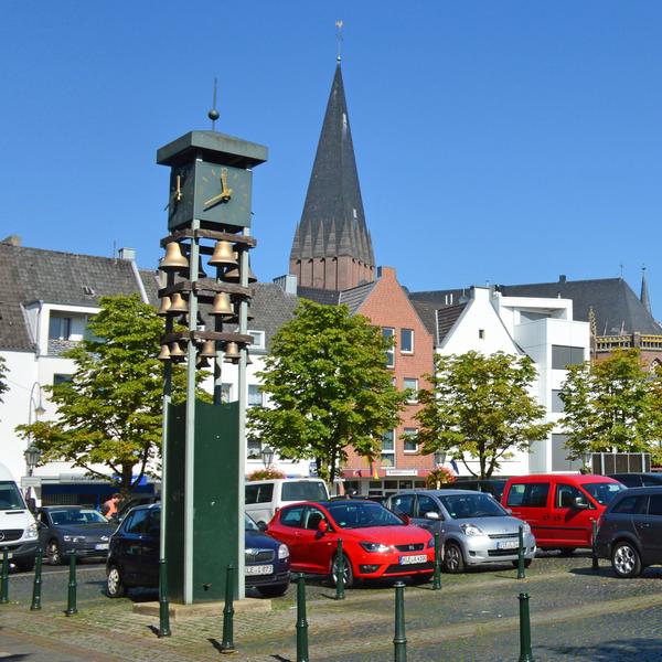 hinten überragt die Kirche St. Maria-Magdalena.Sie gilt als eine der bedeutendsten Backsteinkirchen des Niederrheins, 14. Jh.