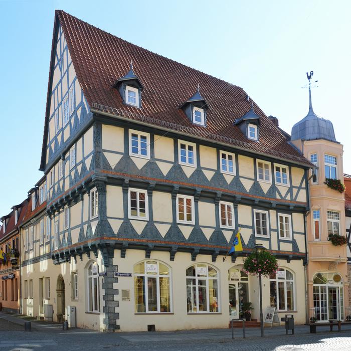 Kühnesches Haus, das verfallene Fachwerkhaus im Stadtkern Haldenslebens erwarb 1875 Goldschmiedemeister Clemens Kühne und ließ es umfassend restaurieren.