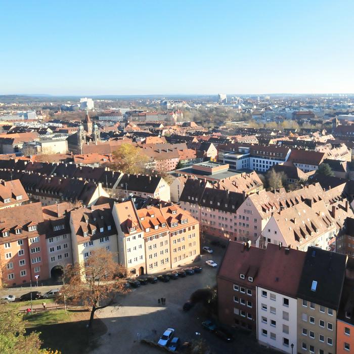 Die Freiungwar einst de Platz, auf dem man vor Verfolgung geschützt blieb. Er bietet eine gute Aussicht auf darunter liegende Altstadt Sebald und weiter.
