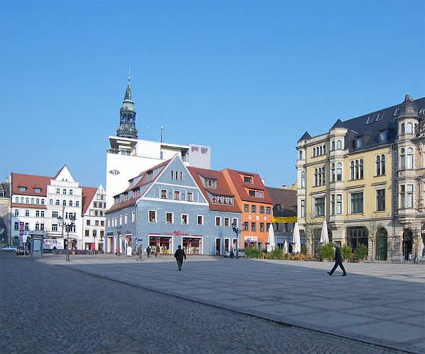 Hauptmark von Zwickau in Richtung West gesehen, eine vielfältig umbaute, beeindruckende Weitung des Platzes.