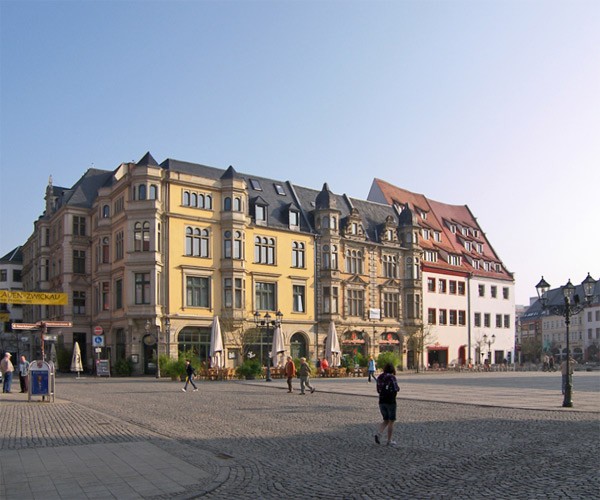 Kräutergewölbe, Löwen-Apotheke. Seit 1561 befindet sich im Haus Hauptmarkt 17 in Zwickau die zweitälteste sächsische Apotheke. Das Kräutergewölbe in der Nordostecke vom Markt, um 1500 errichtet, ist ein typisch spätemittelalterliches Bürgerhaus. |