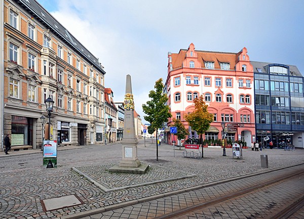 Postdistanzsäule,seit 2002 steht sie wieder da, 4,85 m hoch. Das Obere Stadttor soll sich an eben dieser Stelle befunden haben.