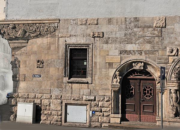 Am Stadthaus 1. Schmuckelemente in Jugendstilam 1908 bis 1910 durch die Städtische Sparkasse errichteten Gebäude, nicht einfach zu entschlüsseln