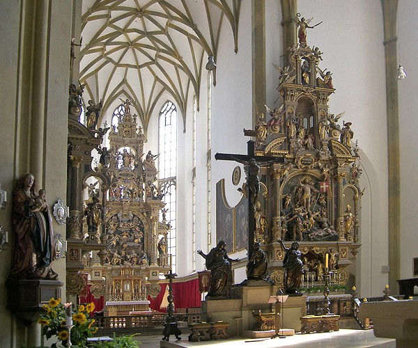 Innenausstattung aus Renaissance- und Barock.Die Basilika St. Ulrich und Afra zählt zu den letzten großen spätgotischen Kirchenbauten in Schwaben. Ihre Zwiebeltürme wurde Vorbild für barocke Kirchen in Bayern.