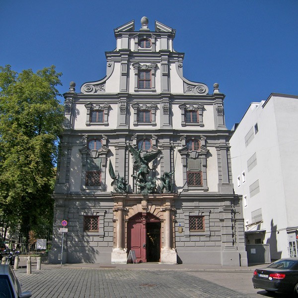 vom Zeughaus zum Bildungszentrum:Das ehemalige Waffenarsenal wurde 1607 von Elias Holl erbaut, die Prunkfassade stammt von Joseph Heintz, die Michaelsgruppe von Hans Reichle.