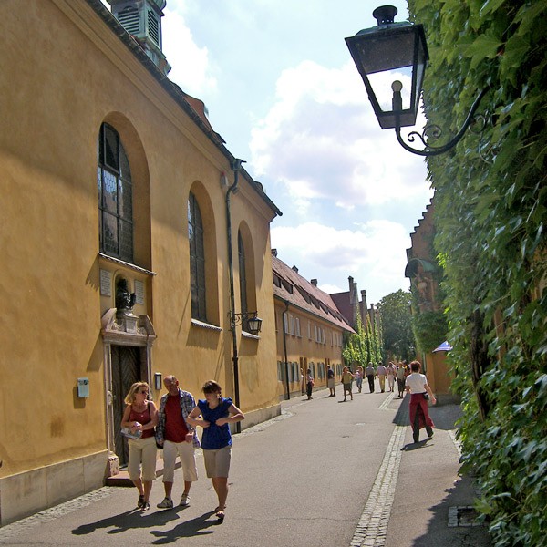 Fuggerei,die 1516 von Jakob Fugger der Reiche mit seinen Brüdern gegründete Sozialsiedlung aus 67 Häusern mit 147 Wohnungen, einer Kirche und einem Brunnen .Die stabile Jahresmiete für eine Wohnung beträgt heute 1 RG (Rheinische Gulden)
