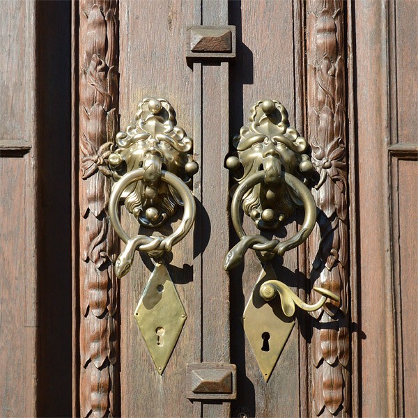 schöne Holztier mit Messingbeschlag,originell und passend die Drücker mit den Apotheker-Schlangen
