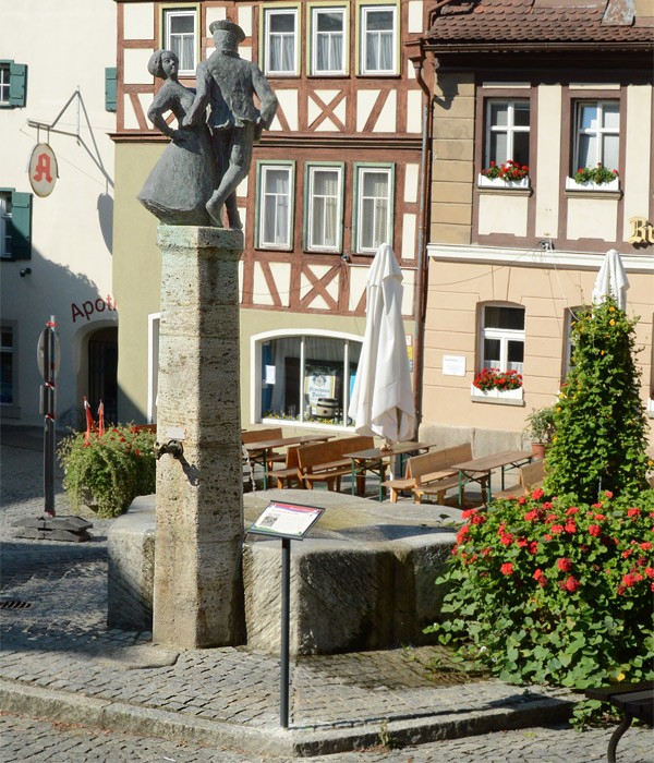 Kornmarkt-Brunnenmit tanzendem Bauernpaar, geschaffen 1987 vom Nürnberger Bildhauer Volkhard Krämer.