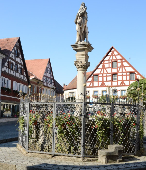 Weinmarktmit Brunnen. Auf der Säule steht seit 1727 Kaiser Karls VI. - als Statue.