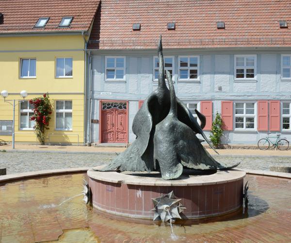 Gänsebrunnen am Marktplatz.Der Bützower Gänsekrieg von 1794 beeinflusste die Entwicklung der Stadt Bützow anscheinend nachhaltig. Als wohlmeinende Mahnung umarmen sich die Gänse mit Flügelschlag im Zentrum.