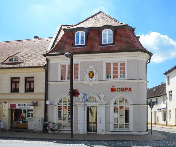Wappen am Gebäude der Sparkasse, gleich mit zwei Bischofsstäben versehen. So verschmelzen kirchliches und weltliches Machtkapital.