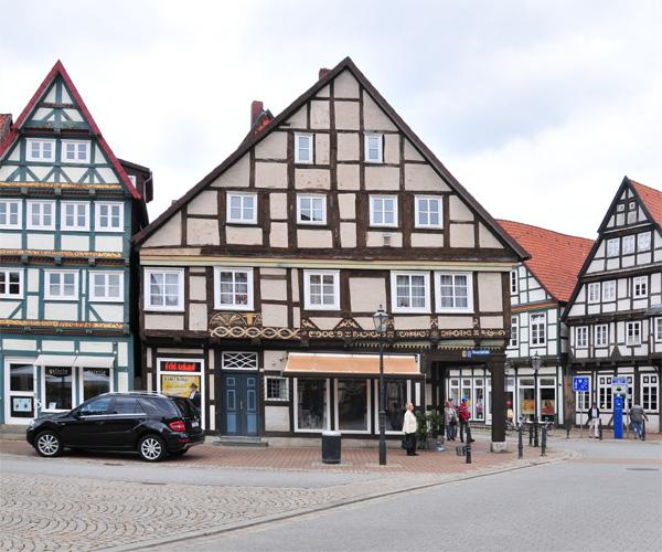 Mauernstraße 32 (links) mit Hinweis auf Baujahr Anno 1625, Haus Nr. 33 mit floralen Motiven und einem Ochsenkopf