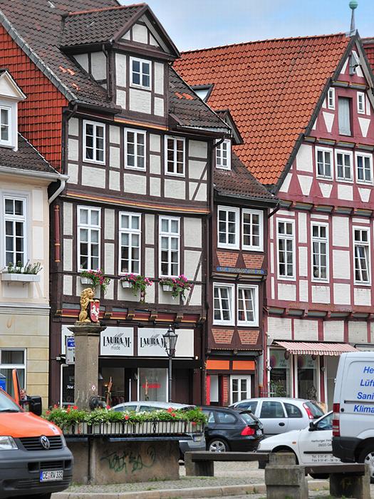 superschmales Fachwerkhauszwischen zwei stattlichen Bürgerhäusern, lt. Balkeninschrift von Karl Borgward Anno 1956 passend eingefügt