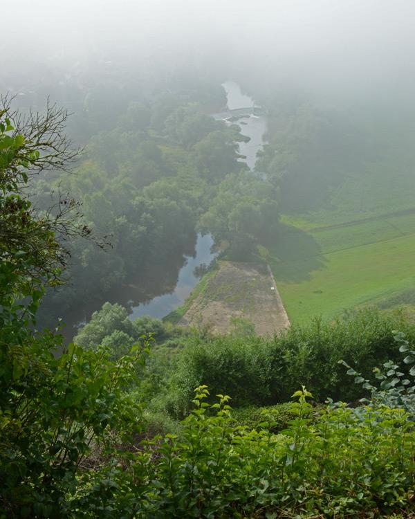 Tiefblickauf die rund 90m tiefer liegende Saale. Hier noch im Morgennebel.