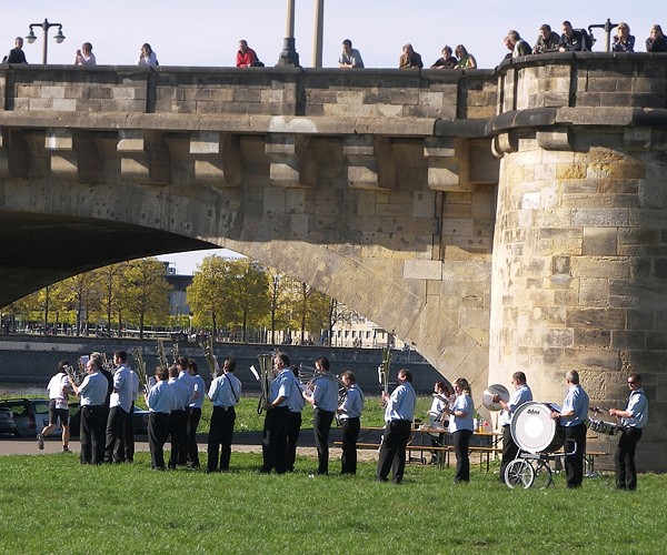 Maraton.Unter der Augustusbrücke hindurch führt der jährliche Maratonlauf, ein sportliches Volkstfest, bei dem auch musikalisch mitmischt.