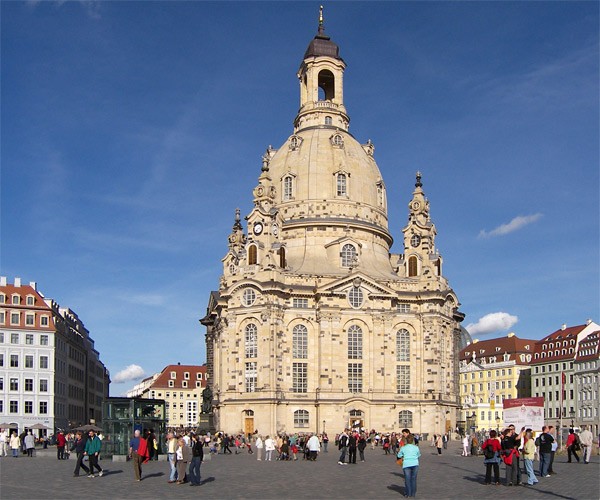 Frauenkirche Dresden, erbaut in der erste Hälfte des 18. Jahrhunderts, 95 m hoch, im Zweiten Weltkrieg zerstört, 2005 offiziell wieder eingeweiht.