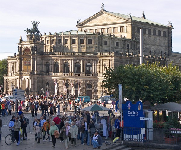Semperoper, TheaterplatzSemperoper am Theaterplatz, 1871/78 von Gottfried Semper erbautes Hoftheater im Stil it. Hochrenaissance, zweimal zerstört, 1977/85 wieder aufgebaut