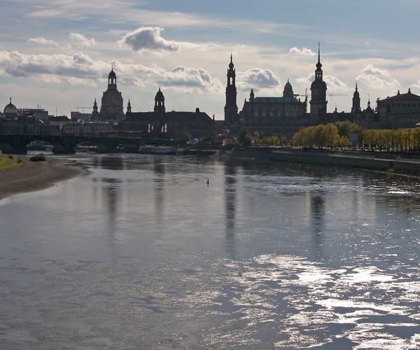 Elbe, Panorama, GegenlichtDresdener Panorama im Gegenlicht, gespiegelt in der Elbe