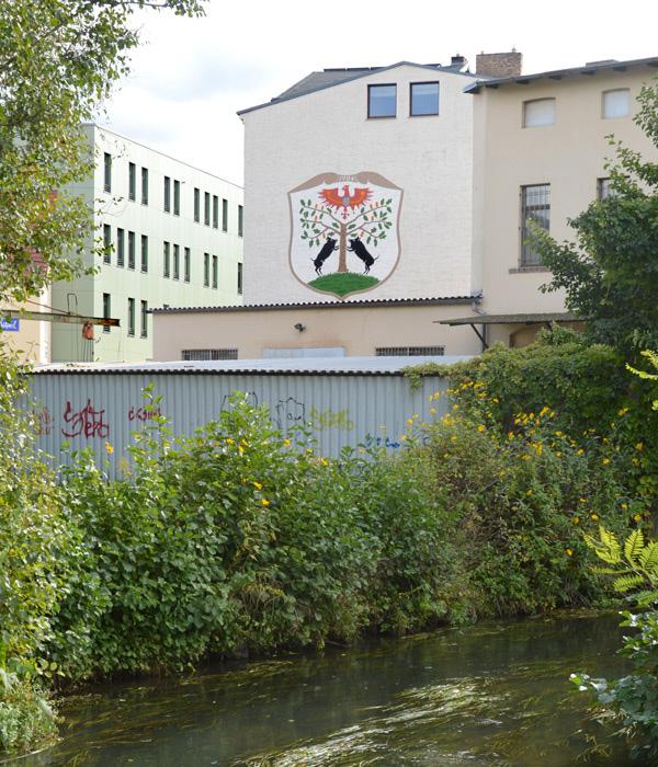 Stadtwappen von Eberswalde,an einer Giebelwand zeigt es zwei "Ebers im Walde"