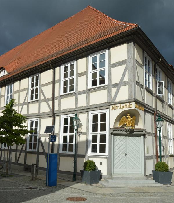 Adle-Apotheke,schlichtes Fachwerkgebäude mit goldenem Adler