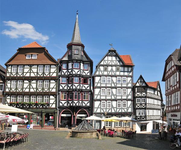 Marktplatz von Fritzlar.Ein Augenschmaus ist die Fachwerkgruppe an der Ostseite an der Ostseite vom Markt, gut im Blickfeld des Rolands seit 1564.