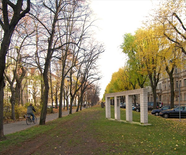 Willy-Brandt-Anlage, ein langer Grünstreifeneine lange Parkalle mit Grün Kunst im Freien zwischen den beachtlichen gründerzeitlichen Hausreihen