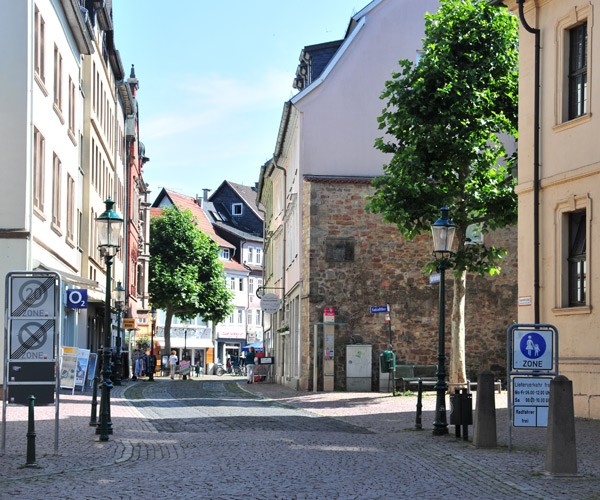 Karlstraße. Wo einst einst das Kohleßtor stand, ist weiter der südlicher Zugang in die Fußgängerzone der Altstadt von Fulda.Rechts ist noch ein Stadtmauerrest zu sehen, gut mit dem Wohnhaus verbunden.
