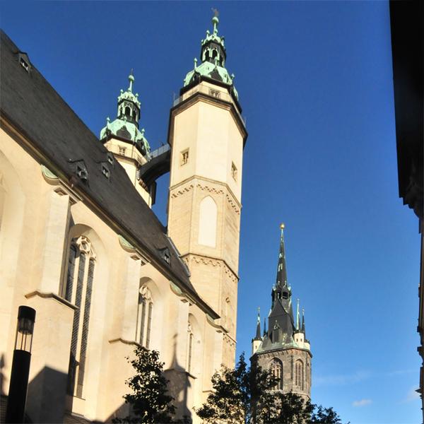 Ost-Doppeltürme der Marktkirche Halle, rechts der Rote Turm, ein freistehender Glockenturm.