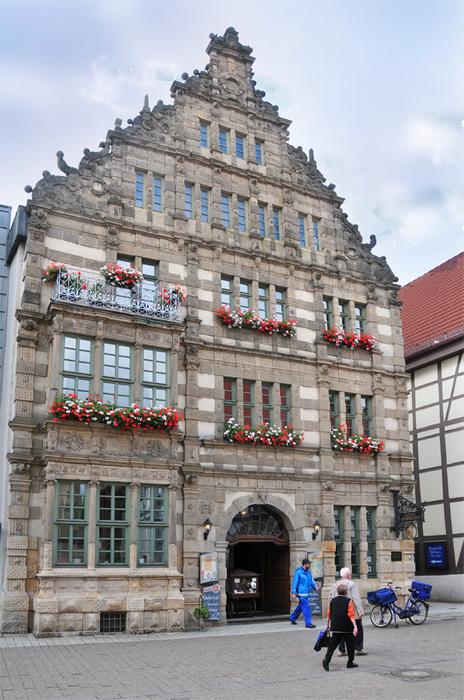 Rattenfängerhaus,1602 errichtetes, dreigeschossiges Bürgerhaus in Weserrenaissance, reich verzierter Giebel mit Erker und Inschrift vom Kinderauszug