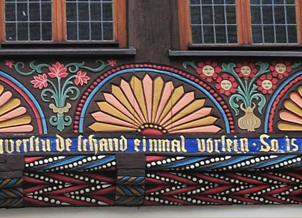 Haus Schäfer in Höxter. Die typische Schmuckelemente im Fachwerk der Weserrenaissance sind Palmetten und Taubänder sind hier gut zu studieren. Da sieht man auch unterschiedliche Blumensträuße, sogar mit lächelnden Blüten.
