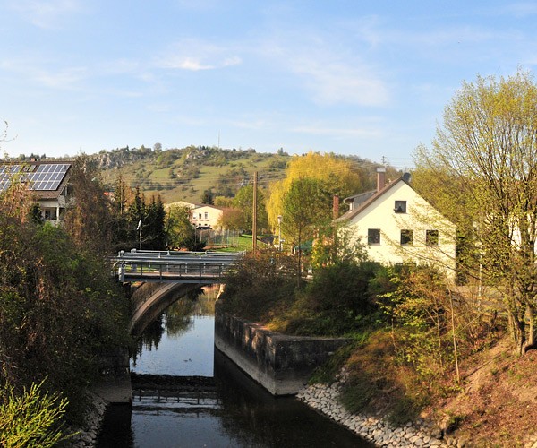 Ziehbrücke am Kanal. Die Altstadt von Kelheim erstreckt sich auf einer Halbinsel zwischen Altmühl und Donau. Verbindende Gräben dienten als Wasserstraße innerhalb die Stadt. Der Wasserstand ist über Sperrschieber regulierbar.