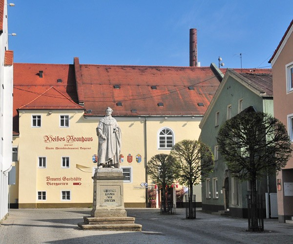 König Ludwig von Bayern am Ludwigsplatzvor dem "Weißen Brauhaus", der ältesten Weissbierbrauerei Bayerns (1607)