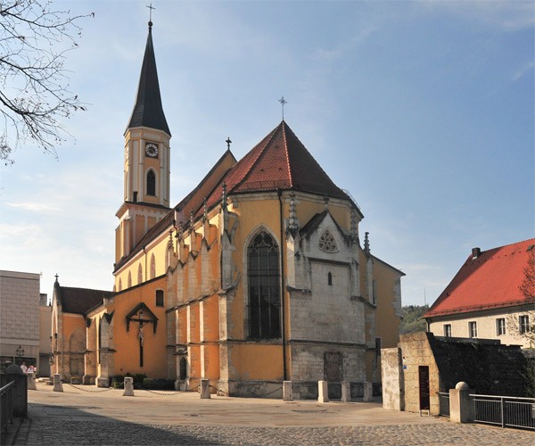Stadtpfarrkirche Mariä Himmelfahrt.Das Langhaus wurde um 1420 erbaut, Chor um 1460. Der Turm war einst freistehend, erneuert 1862. 1885 wurde das Langhaus velängert.