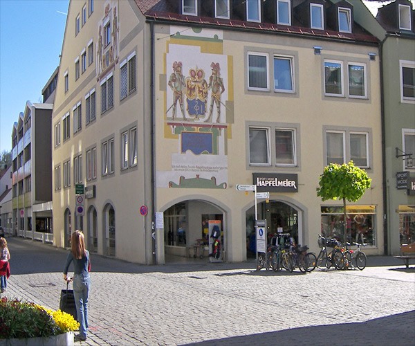 Fassadenmalerei an einem Eckhaus hinter dem Rathaus.Oder sollte man hier besser von Lüftlmalerei sprechen?