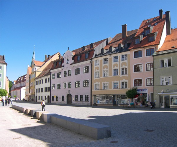 Rathausplatz, nicht umerfend, dafür gefällig. die Reihenhäuser am Markt.