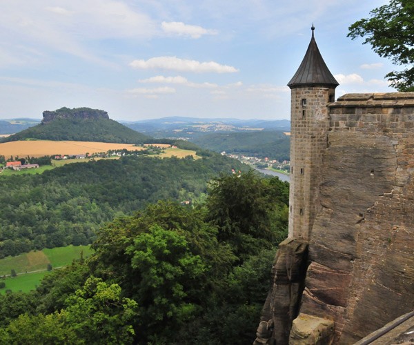 Hungerturm mit Lilienstein. Der schlanke Hungerturm zwang sicher zum extra abhungern um hinein zu passen - gute Idee!