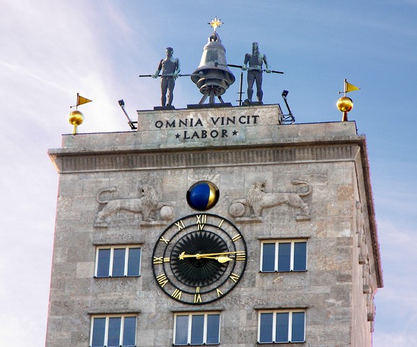 Hammermänner auf dem Kroch- Hochhaus.De Gloggenmänner am Augustusplatz dreschn gern ma mitn Hammer of de Glogge.