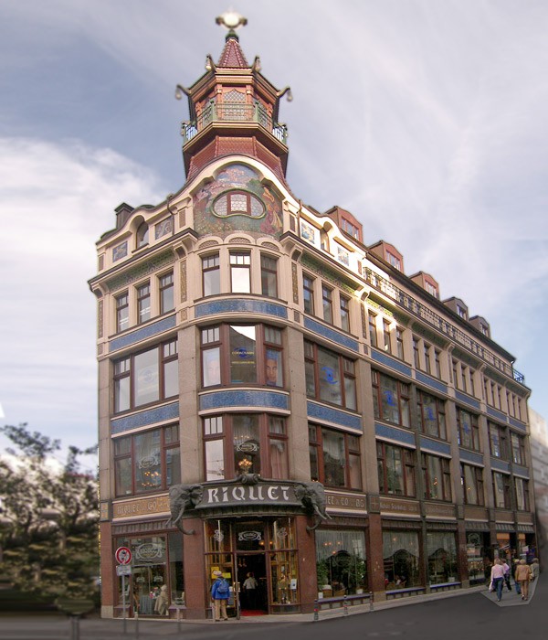 Riquet-Haus, ehem. Geschäftshaus der Firma Riquet & Co. Es wurde 1908/09 errichtet. Zwei die Eingangstür flankierende Elefantenköpfe waren das Markenzeichen der Firma Riquet. Architekte war Paul Lange.