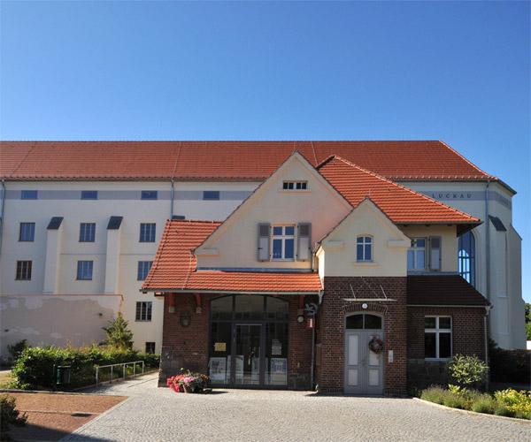 Luckaus Toristinformationund Fragen zum Gebäude dahinter.