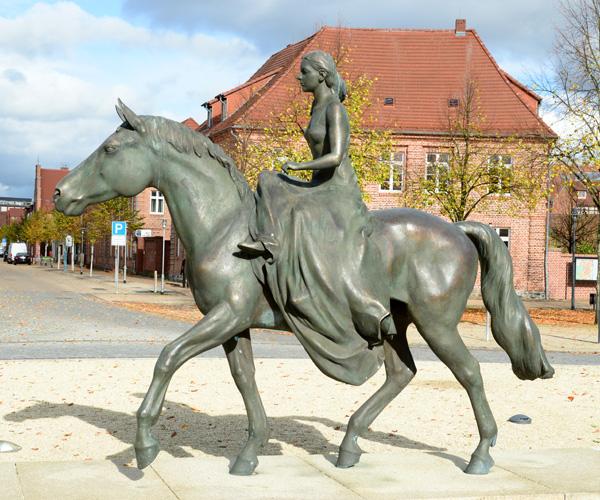 Standbild einer Reitenden. Die Bronzeskulptur am Alexandrinenplatz soll die einstige Großherzogin von Mecklenburg-Schwerin darstellen.