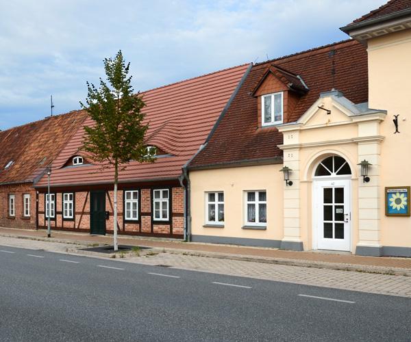 Straßenbildmit Mecklenburger Hof rechts und anschließendem Fachwerkhaus mit Fledermausgauben im Satteldach