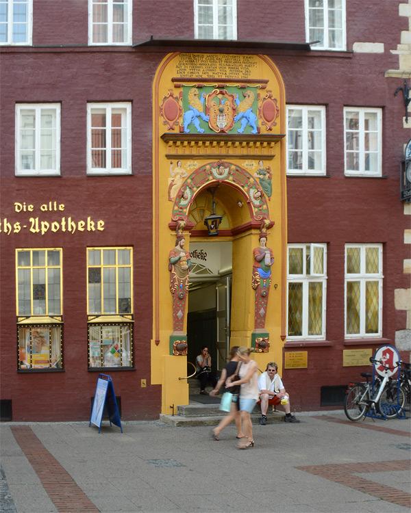 Alte Raths-Apotheke (1598), Lüneburger Bürgerhaus mit verziertem Giebel und Sandsteinportal