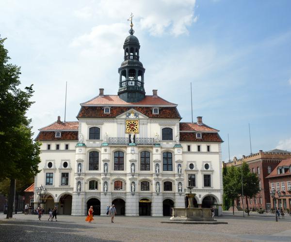 Rathaus Lüneburg,1240 am Neumarkt erbaut, bis ins 18. Jh. eerweitert. Die Ostfassade 1870 neurenaissance verziert