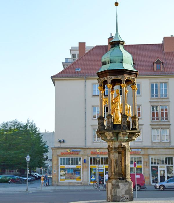 Magdeburger Reiter vor dem Rathaus. Das erstes freistehende Reiterdenkmal Deutschlands stellt vermutlich Otto l. dar. Es entstand um 1240 und ist seit 1651 mit dem barocken Baldachin versehen.