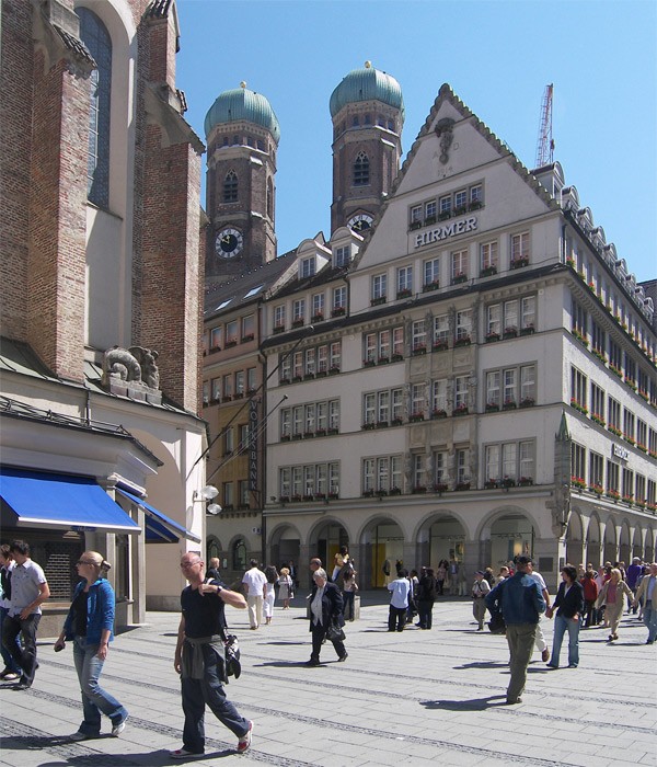 in der fußgängerbewegten Neuhauser Straße.Die Doppeltürme der Liebfrauenkirche sind ein Wahrzeichen Münchens.