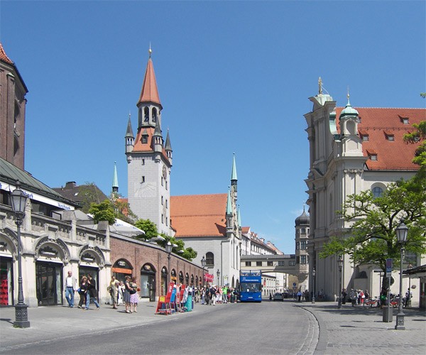 Vom Viktualienmarkt,flankiert von St. Peter und Dreifaltigkeitskirche, zum Turm mit Spielzeugmuseum geblickt